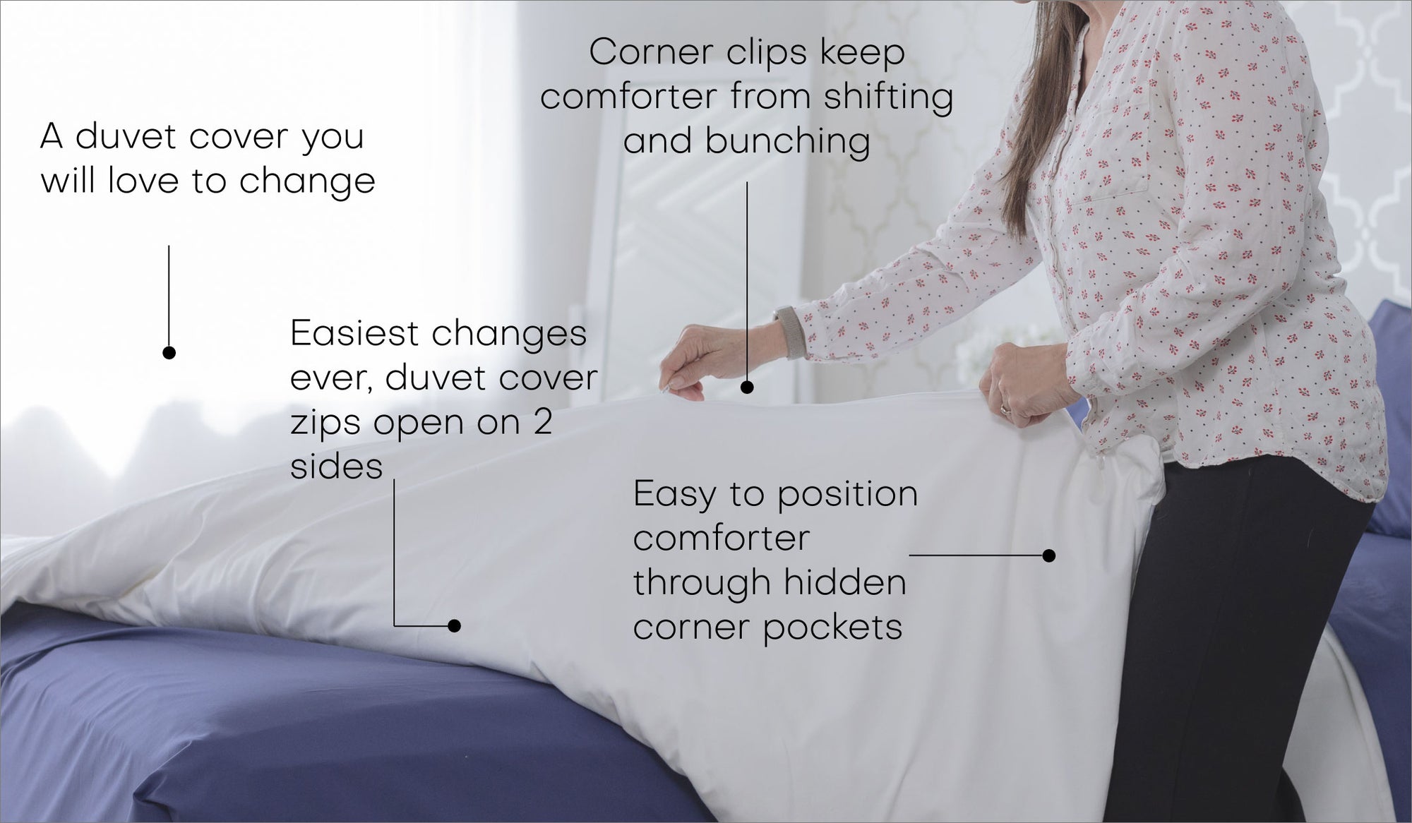 Our most popular top-of bed product. We love duvet covers (stuffed with our coordinating comforter) for their plush and lofty comfort , flexibility, and styling. So just like the rest of our bedding system, we redesigned ours to be smarter, faster, and more comfortable. The New-Way Zip Duvet Cover eliminates the hassles of changing your duvet with a zipper that extends along two sides, clips to hold your comforter insde to prevent bunching and sliding and hidden vents provide easy access.