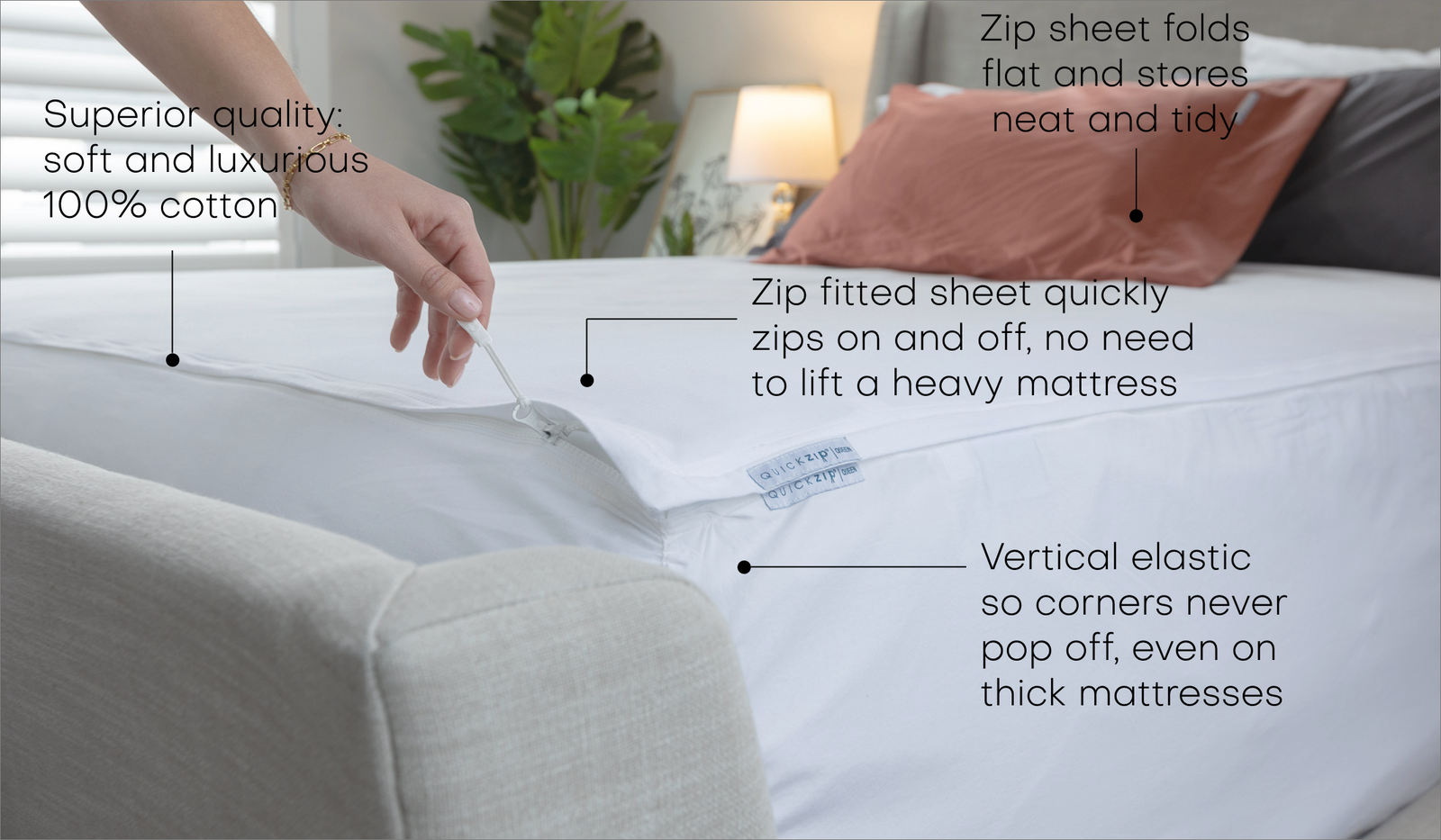 QuickZip bedding fits standard US mattress sizes Crib through California King (plus special RV and Flex Top sizes). The fitted sheets have vertical elastic in the corners so they'll flex to fit a wide range of mattress thicknesses (AKA “drop” or “pocket”), and shapes (including many rounded corners).