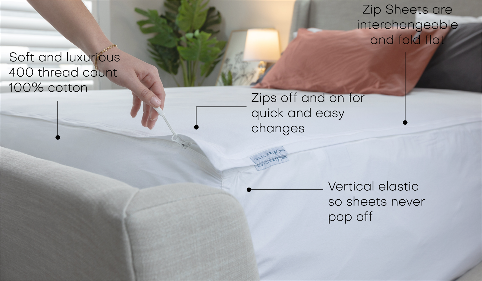 The 2-piece zipper design makes for fast & easy changing. Simply zip the top part of the fitted sheet (the "Zip Sheet") on and off while leaving the bottom part (the "Base") on the mattress. Once the Base is on, the interchangeable Zip Sheets allow easy changes to a fresh new fabric, color, or pattern!